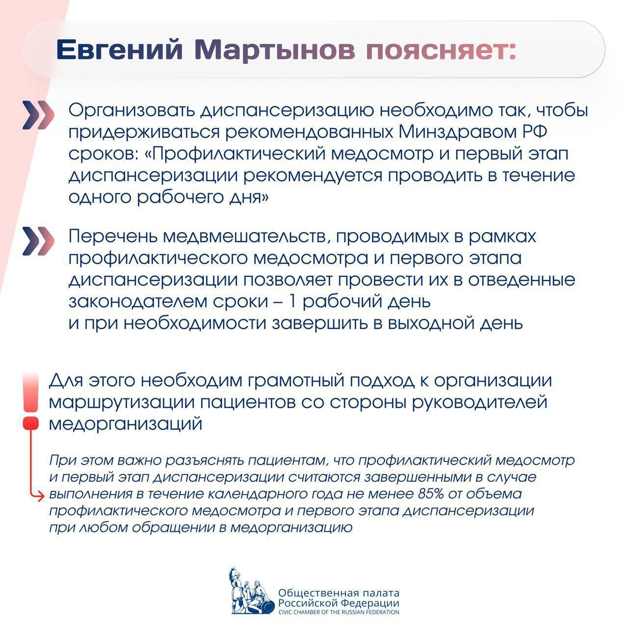 Заместитель председателя Общественной палаты Московской области, член Общественной палаты Российской Федерации Евгений Мартынов в телеграм-канале Общественной палаты Российской Федерации ( https://t.me/oprf_official ) рассказал, как бороться с проблемами, возникающими при прохождении диспансеризации.