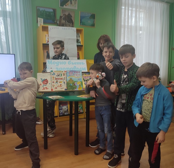 Библиотекарь рассказала детям, что для здоровья очень полезно заниматься физкультурой и спортом. Каждый участник показал свои «фирменные» упражнения для утренней зарядки. Продолжилось мероприятие веселыми спортивными соревнованиями.