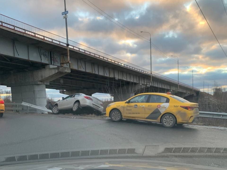 Иномарка вылетела с дороги и протаранила ограждение у эстакады через реку Мочу
