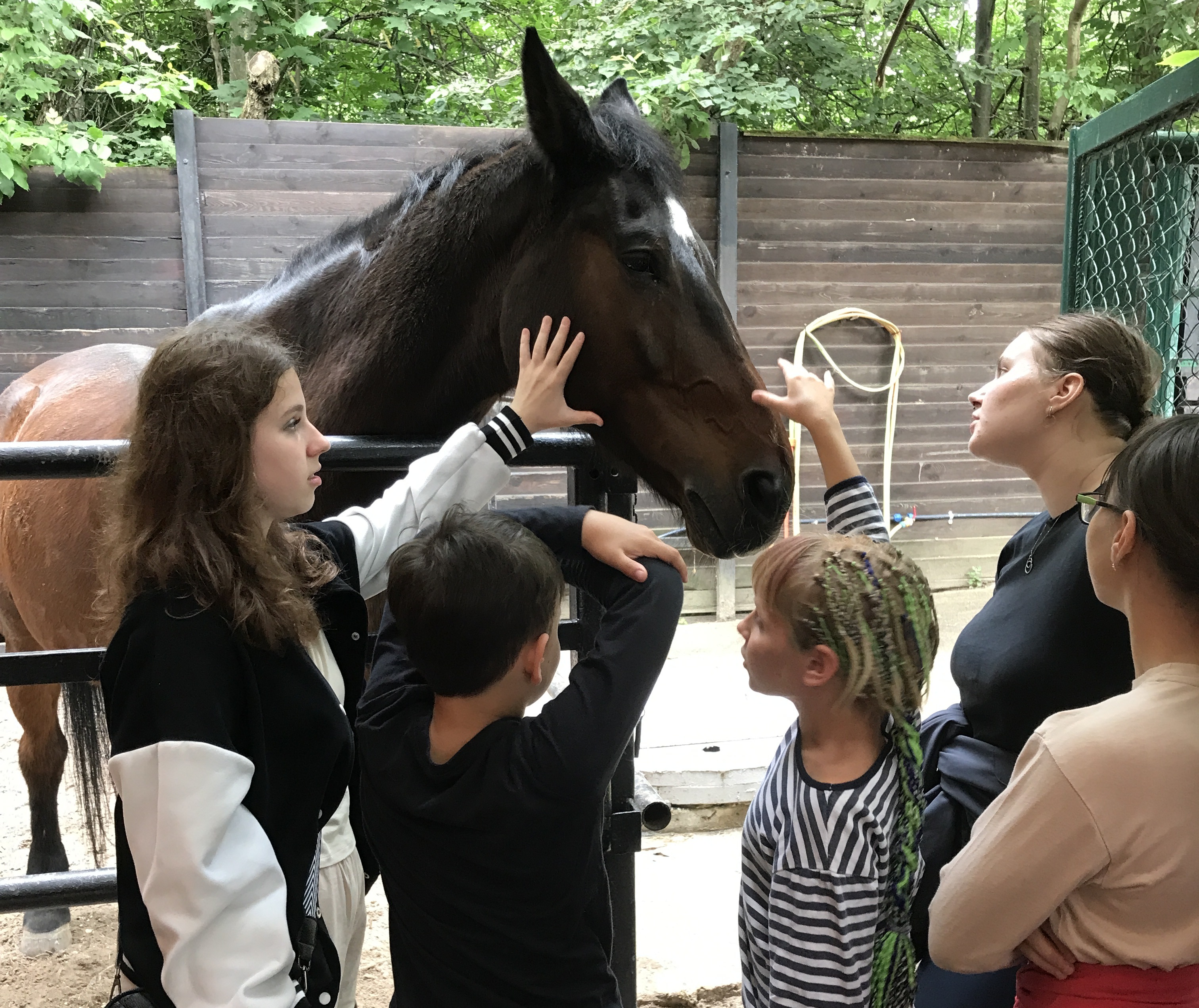 Экскурсию на конюшню ребятам предложила девятиклассница Лера Кабанова. «Сколько себя помню, я всегда любила лошадей, просила маму купить игрушечных лошадок, раскраски. Лет в шесть бабушка привела меня в конноспортивный клуб «ИППО» посмотреть на настоящих лошадок, угостить их морковкой и яблоками, – вспоминает Лера. – Бабушка сама мечтала ездить верхом, но не вышло, и она осуществила эту мечту со мной». Девочка сначала каталась на пони. Повзрослев, пересела на лошадь. В 14 лет поступила в Школу верховой езды. «Это абсолютное счастье! Мне нравится общаться и ухаживать за этими грациозными животными», – говорит она. В подростковый клуб Лера пришла год назад за компанию с подружкой. «Первое занятие, на которое я попала, было посвящено уходу за кожей лица. Это был интересный мастер-класс, – делится девушка. – На тренингах раскрывается много важных тем. Ребята все хорошие, общительные. Я рассказала о моём увлечении, поделилась частичкой своего счастья от занятия любимым делом, и все заинтересовались». КСК «ИППО» находится рядом с Троицком, можно дойти пешком. На экскурсии «Знакомство с лошадью» дети узнали правила поведения с животными, угостили их морковкой и сахаром, прокатились верхом.