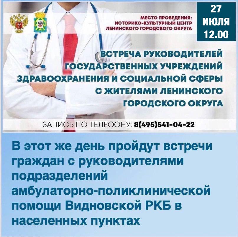 27 июля пройдет встреча руководителей амбулаторно-поликлинический помощи Видновской РКБ с жителями Ленинского городского округа.